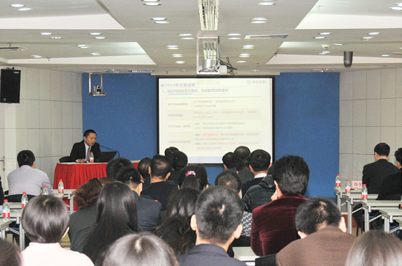 張總裁在會議上做了2014年年度工作報告及2015年工作安排,全面客觀地回顧了一年來公司各項工作進展情況,發(fā)現(xiàn)問題,總結(jié)得失,并根據(jù)戰(zhàn)略規(guī)劃部署了新一年重點工作任務(wù)。2014年是公司進行戰(zhàn)略轉(zhuǎn)型的第一年,在“抓住機遇、提質(zhì)增效”的指導(dǎo)思想下,圍繞抓好融資結(jié)構(gòu)升級和風(fēng)控手段創(chuàng)新兩個著力點,加快干部隊伍建設(shè)梯隊化和年輕化步伐,構(gòu)建了“業(yè)務(wù)行業(yè)化、融資多元化、風(fēng)控專業(yè)化”的經(jīng)營新格局。