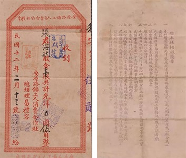 江西萍鄉(xiāng)煤礦自1898年開(kāi)辦起,安源工人便在經(jīng)濟(jì)上深受剝削,礦局拖欠工資,奸商哄抬物價(jià)。為了維護(hù)工人利益,減少商人的中間盤(pán)剝,1922年5月中國(guó)共產(chǎn)黨領(lǐng)導(dǎo)的安源路礦工人俱樂(lè)部成立不久,便于同年7月創(chuàng)辦了中國(guó)工人階級(jí)最早的經(jīng)濟(jì)組織——安源路礦工人消費(fèi)合作社。隨著規(guī)模和經(jīng)營(yíng)范圍進(jìn)一步擴(kuò)大,消費(fèi)合作社流轉(zhuǎn)資金嚴(yán)重不足,出現(xiàn)了貨品短缺的窘境。為了解決資金不足的問(wèn)題,1923年初,消費(fèi)合作社決定在俱樂(lè)部部員中招股,制定了《招股簡(jiǎn)章》。工人們深信消費(fèi)合作社就是為大家謀利益的經(jīng)濟(jì)實(shí)體,盡管十分困難,仍踴躍認(rèn)購(gòu)股票,很快就籌集到股金7800余元,連同俱樂(lè)部撥來(lái)的活動(dòng)經(jīng)費(fèi)一起,共計(jì)資金1.8萬(wàn)余元。消費(fèi)合作社給每位認(rèn)股者發(fā)了自行設(shè)計(jì)的股票作為憑證。