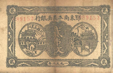 鄂豫皖革命根據(jù)地是在1927-1929年期間鄂東北的黃麻起義、豫東南的商南起義、皖西的六霍起義等基礎(chǔ)上,創(chuàng)立的在鄂豫皖三省邊界以大別山為中心的革命根據(jù)地。1930年10月,鄂豫皖特區(qū)蘇維埃銀行在七里坪成立,其職能主要是通過(guò)借貸、儲(chǔ)蓄、兌換等業(yè)務(wù)工作,籌集資金,幫助根據(jù)地的人民發(fā)展工、農(nóng)、商業(yè)。對(duì)于農(nóng)民用于購(gòu)置耕牛、農(nóng)具、種子的貸款,一律免息,其余貸款酌量收息。銀行還發(fā)行過(guò)多種面值的紙幣、布幣、銅幣、銀元和“經(jīng)濟(jì)公社流通券”(購(gòu)油、布等物的憑證)。
