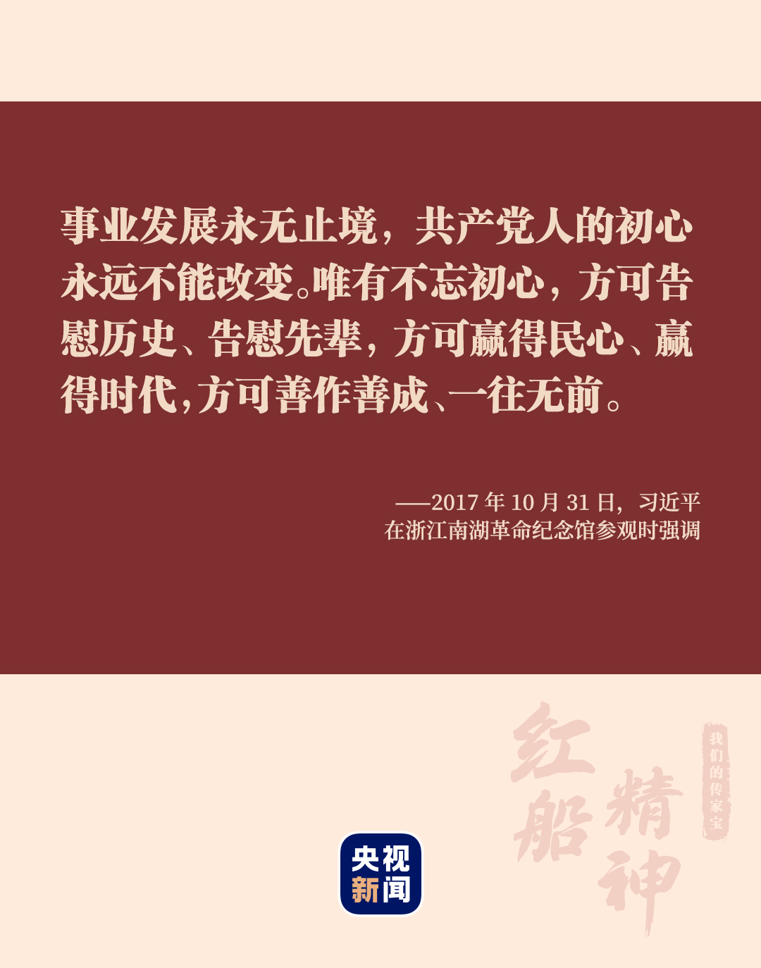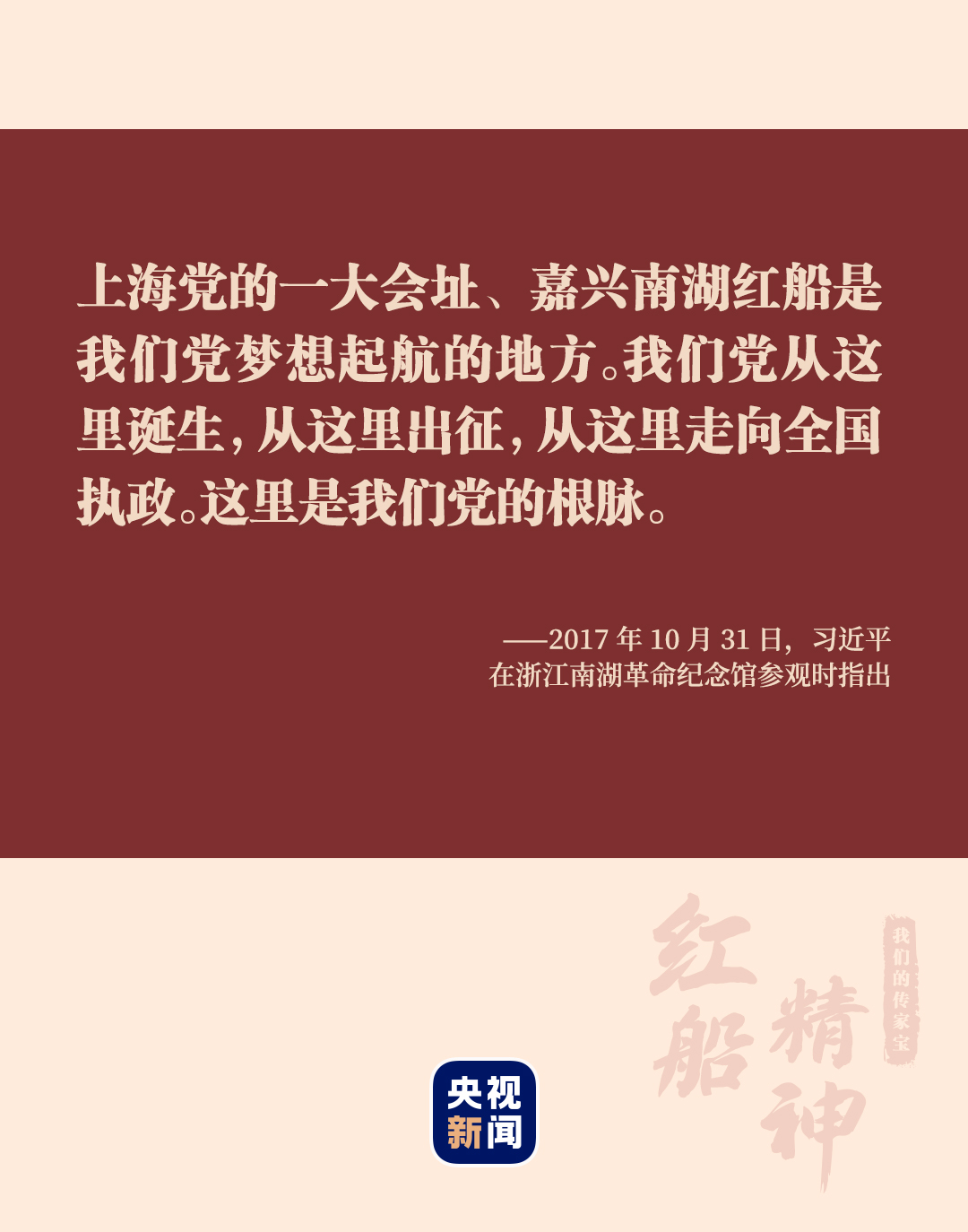 “小小紅船承載千鈞,播下了中國革命的火種,開啟了中國共產(chǎn)黨的跨世紀航程。”2017年10月31日,黨的十九大勝利閉幕僅一周,習近平總書記帶領中共中央政治局常委專程趕赴嘉興南湖瞻仰紅船。