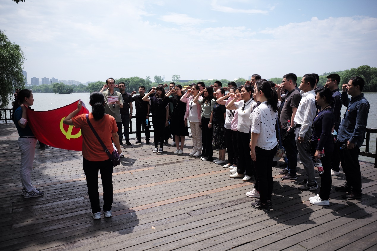 面對著南湖紅船和鮮艷的黨旗,在公司黨委副書記郄少杰領(lǐng)誓下,進(jìn)行了新黨員入黨宣誓、老黨員重溫入黨誓詞,全體黨員高舉右拳,鏗鏘有力的宣誓聲響徹湖畔。