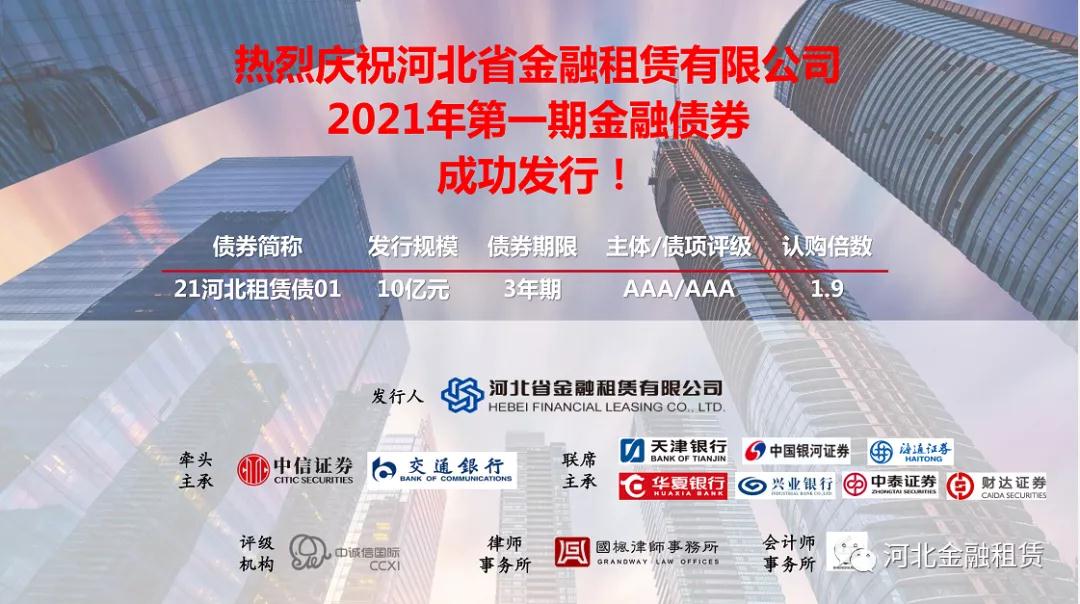 日前,河北省金融租賃有限公司(以下簡(jiǎn)稱“河北金租”或“公司”)成功發(fā)行2021年第一期金融債券,本期債券由中信證券和交通銀行為牽頭主承銷商,獲得了各家金融機(jī)構(gòu)的積極認(rèn)購,發(fā)行規(guī)模10億元,期限3年。此次債券的圓滿發(fā)行進(jìn)一步在市場(chǎng)樹立了河北金租穩(wěn)健進(jìn)取、持續(xù)發(fā)展的形象。
