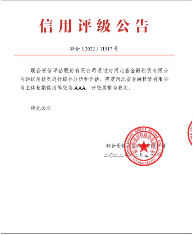 雙AAA!日前,河北省金融租賃有限公司正式獲得聯(lián)合資信評估股份有限公司AAA主體長期信用等級,加上此前持有的中誠信國際信用評級有限公司AAA主體長期信用等級,成為首家獲得雙AAA主體信用等級的金租公司,為自身持續(xù)優(yōu)化融資結構、拓展融資渠道、提升信用形象奠定了基礎。