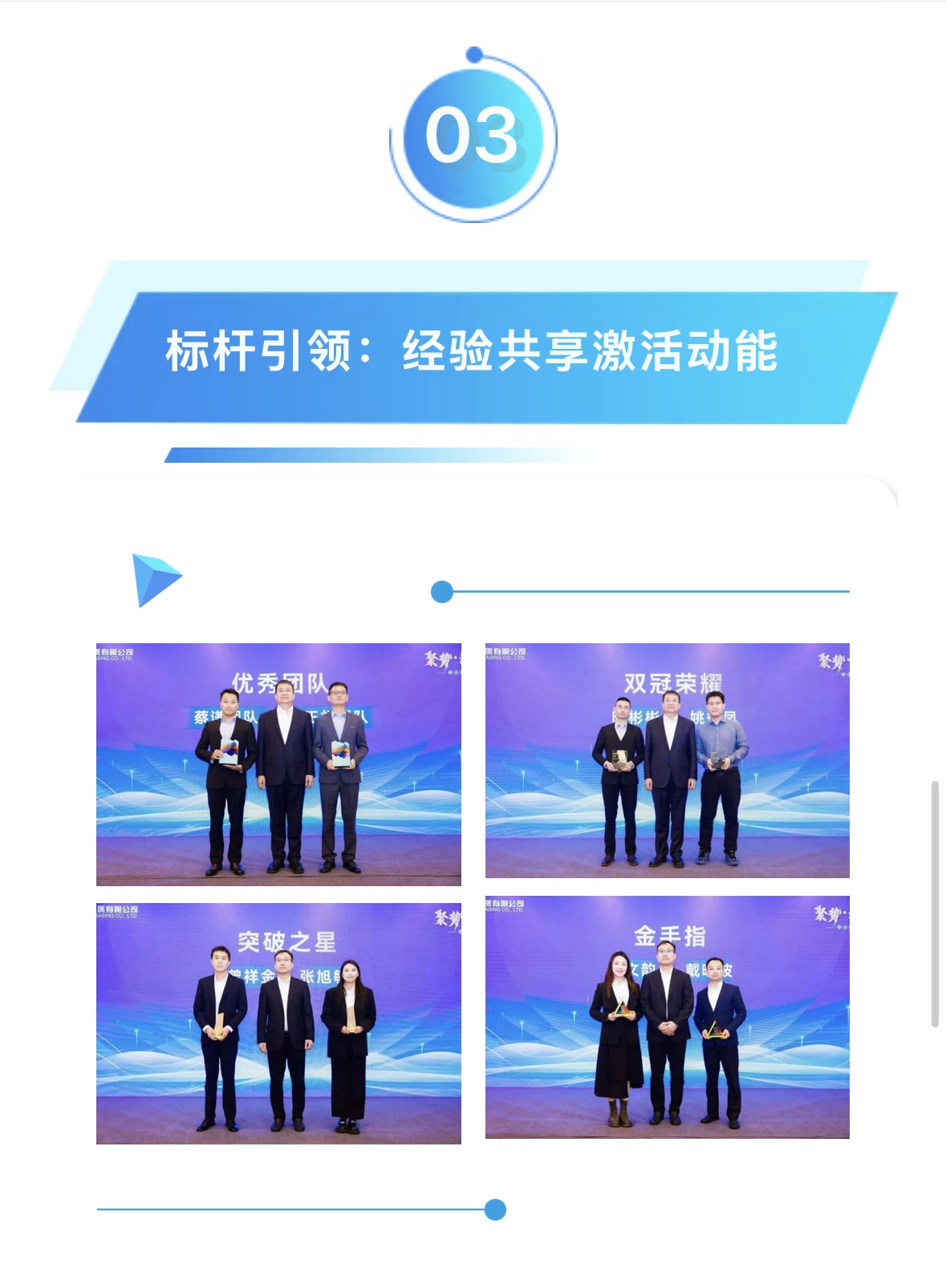 在榮譽時刻環(huán)節(jié),21位優(yōu)秀員工依次登臺,接受屬于他們的榮耀時刻。通過優(yōu)中選優(yōu),團隊推出由6位業(yè)務精英,登臺分享業(yè)務破局密碼,內(nèi)容涵蓋客戶談判策略、優(yōu)秀團隊經(jīng)營理念、渠道建設經(jīng)驗等……現(xiàn)場伙伴受益匪淺。