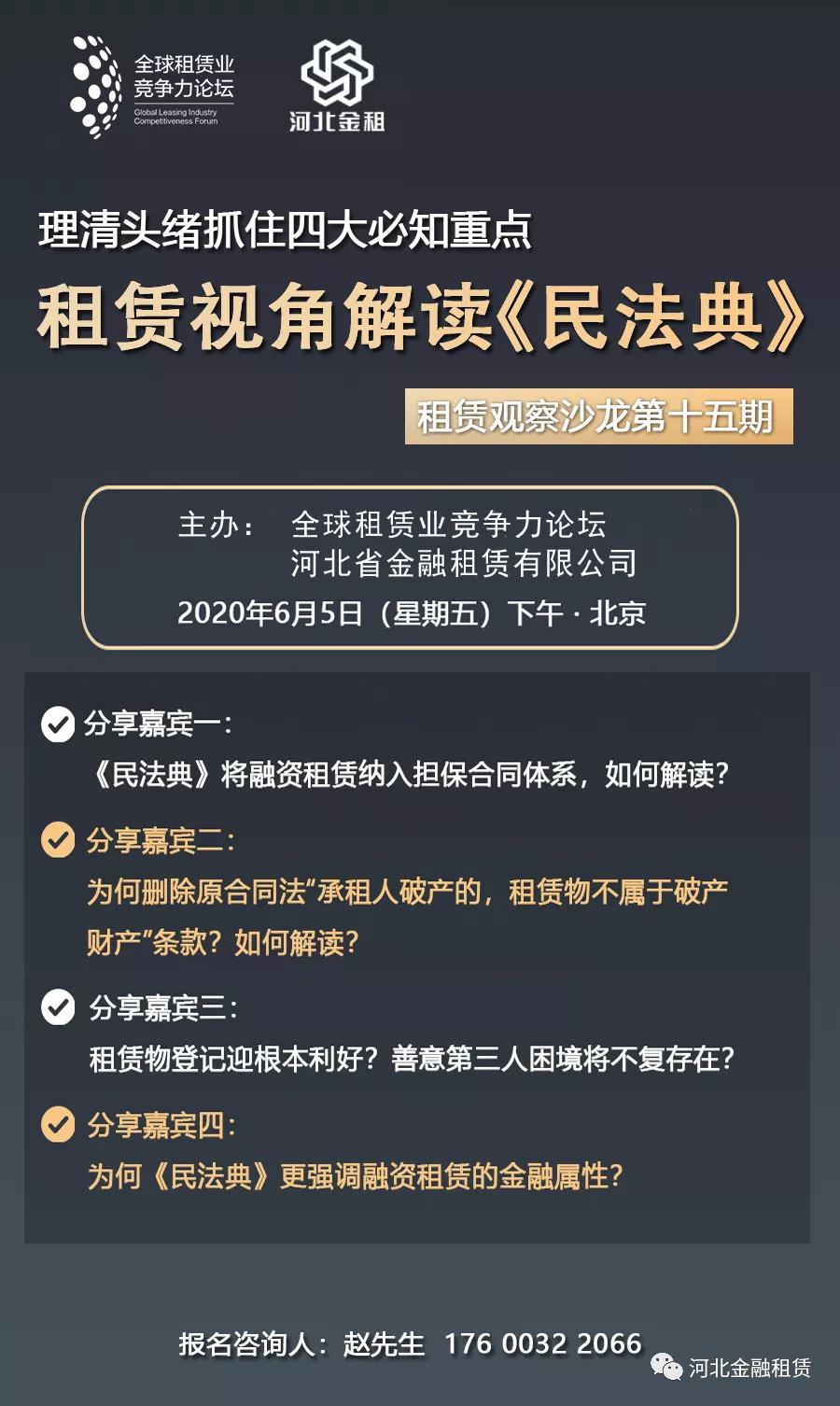 《中華人民共和國民法典》近日正式公布,標(biāo)志我國“民法典時代”到來。《民法典》涉及多項與融資租賃密切相關(guān)的法律條款,擴(kuò)大了動產(chǎn)擔(dān)保合同的范圍,將融資租賃納入擔(dān)保合同,將對融資租賃業(yè)的經(jīng)營活動產(chǎn)生深遠(yuǎn)影響。 6月5日下午,全球…