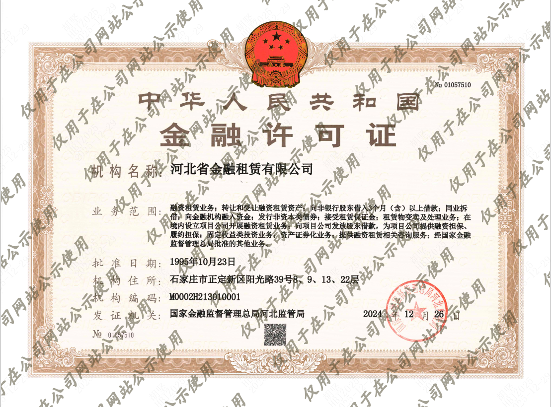 根據(jù)《國(guó)家金融監(jiān)督管理總局辦公室關(guān)于加強(qiáng)銀行保險(xiǎn)機(jī)構(gòu)許可證管理的通知》(金辦便函〔2023〕515號(hào))文件要求,河北省金融租賃有限公司于2024年12月26日換領(lǐng)新《中華人民共和國(guó)金融許可證》,現(xiàn)予以公示。